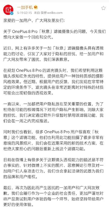 5月19日凌晨2时许,一加手机在官方微博上致歉并表示,道歉后,一加手机称,为了杜绝在可能的极端情况下对用户隐私产生影响,决定通过软件升级暂时禁用该滤镜功能,并会在一周之内完成推送。