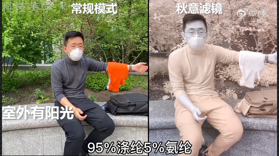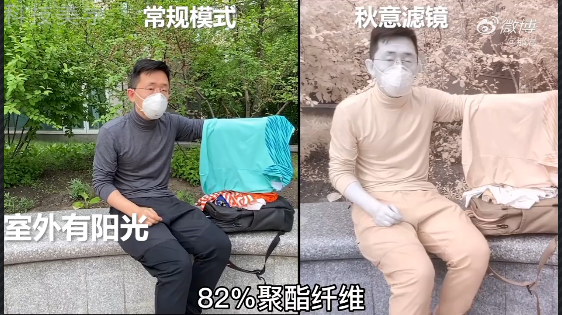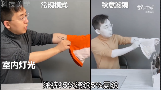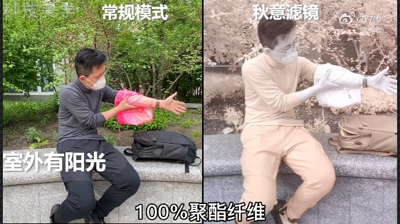 而将一张写了字的A4纸放到一件T恤衫里,开启“秋意”滤镜后,A4纸上的字肉眼就可以看清。