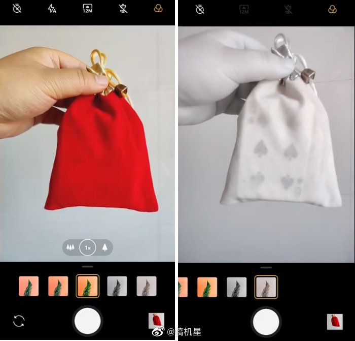 测试在一个红色的布袋里装了扑克牌,通过一加手机的“秋意”滤镜可以大致看清扑克的牌面。