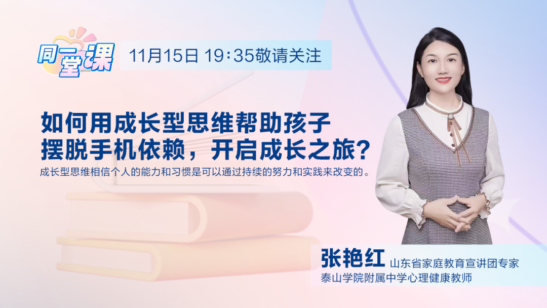 今晚(11月15日)19:35,山东省家庭教育宣讲团专家,泰山学院附属中学心理健康教师张艳红将通过成长型思维的概念和原理,结合实际案例,分享一系列基于成长型思维的实用策略和方法,助力家长引导孩子树立正确的手机使用观念,培养孩子的自我管理能力!