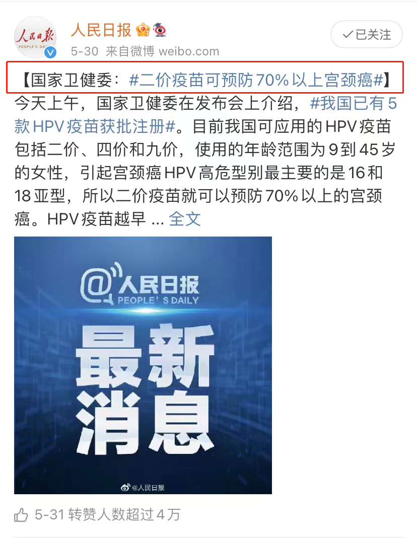 正因HPV疫苗作为预防宫颈癌的一级有效措施。所以,5月30日,国家卫生健康委召开新闻发布会,表示:二价疫苗就可以预防70%以上的宫颈癌,也就是绝大多数的宫颈癌。且越早接种,效果越好。